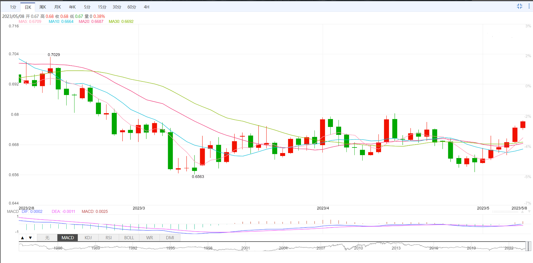 澳元兑美元刷新了当日高点0.6770。澳元资产的上行倾向是美元多重逆风的结果。对美国银行业恐慌、债务上限危机的不确定性以及令人印象不佳的非农就业报告的担忧日益加剧,这些都阻碍了美元出现任何有意义的复苏。在澳元方面,投资者正在等待季度零售销售数据的发布。初步报告显示,季度零售需求将收缩0.4%,而之前的收缩幅度为0.2%。这可能会让澳大利亚储备银行(RBA)保持利率稳定,因为零售需求下降不利于政策收紧。