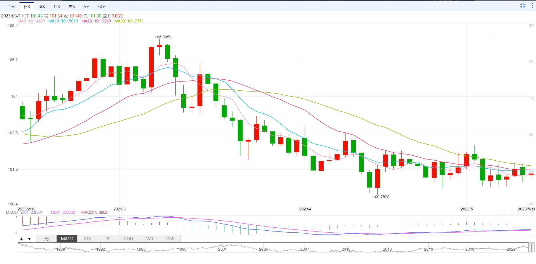 东京交易时段,美元兑日元倾向于追踪的10年期美国公债收益率下滑至3.4252%,隔夜在美国公布4月消费者物价同比涨幅两年来首次放缓至5%以下后,10年期美债收益率下跌8个基点。