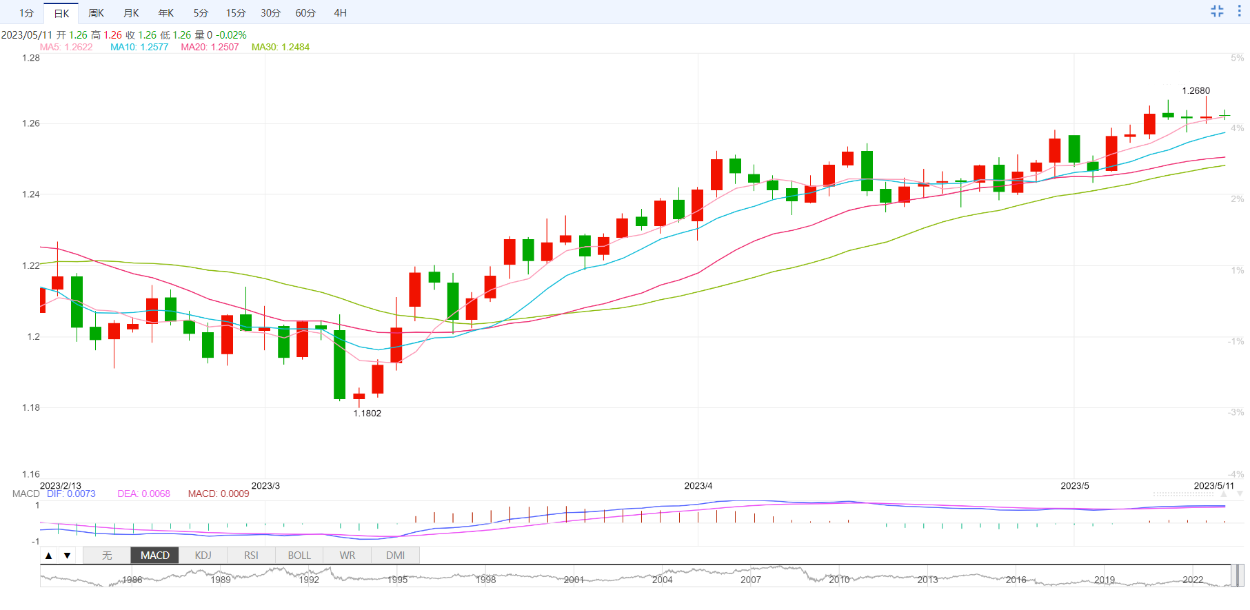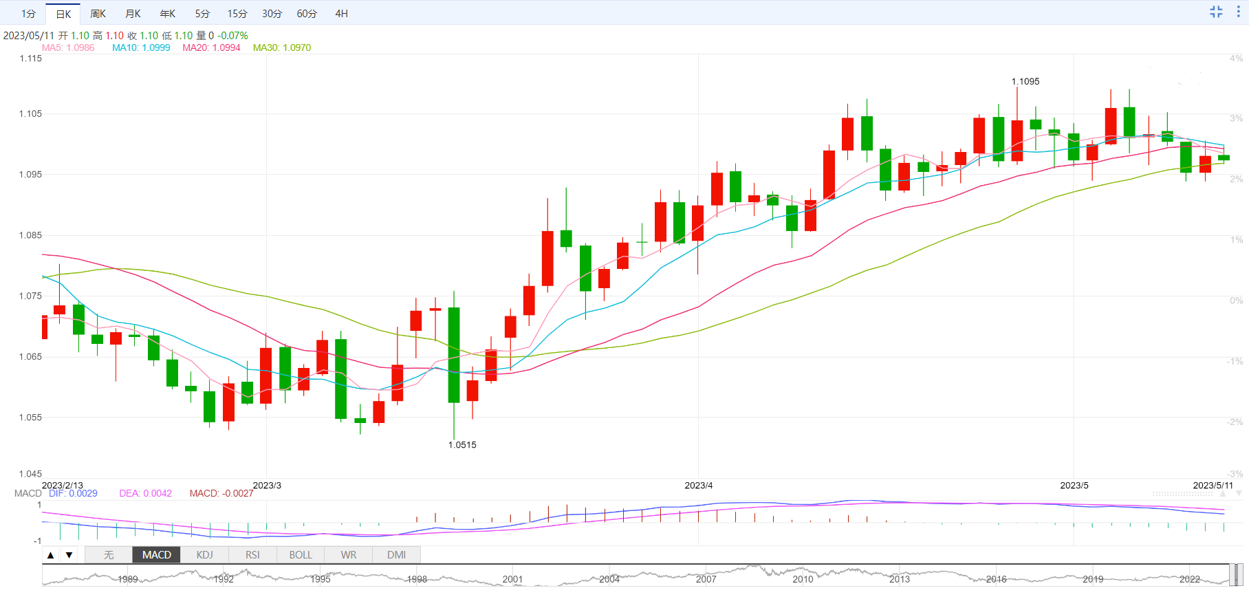 美元指数:截止发稿,美元指数上涨,现报101.64,涨幅0.20%。欧市盘前,美元指数在该区间的下端保持了一周的盘整情绪,目前在101.00附近有坚实的支撑。目前美元的价格走势继续与美联储紧缩周期最快将在6月14日会议上陷入僵局的预期相符。芝加哥商品交易所集团(CME Group)的美联储观察工具(FedWatch Tool)认为,这种情况发生的可能性接近94%。美国4月通胀率年率回落至4.9%,市场预期为5.0%,为两年内首次跌破5%。不过核心CPI依然良莠不齐,加剧了对美联储在2023年出现政策转向传闻的质疑。