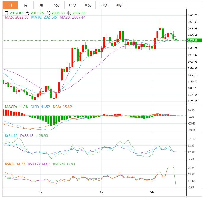 现货黄金:截止发稿,现货黄金小幅看跌,现报2009.74,跌幅0.25%。欧市盘前,黄金价格刷新盘中低点,接近2012美元,在美国债务上限谈判和银行业困境引发市场担忧的情况下,连续第三个交易日下跌。同样给金价带来下行压力的,可能是收益率走软,以及在美国出现更多通胀迹象之前的谨慎情绪。