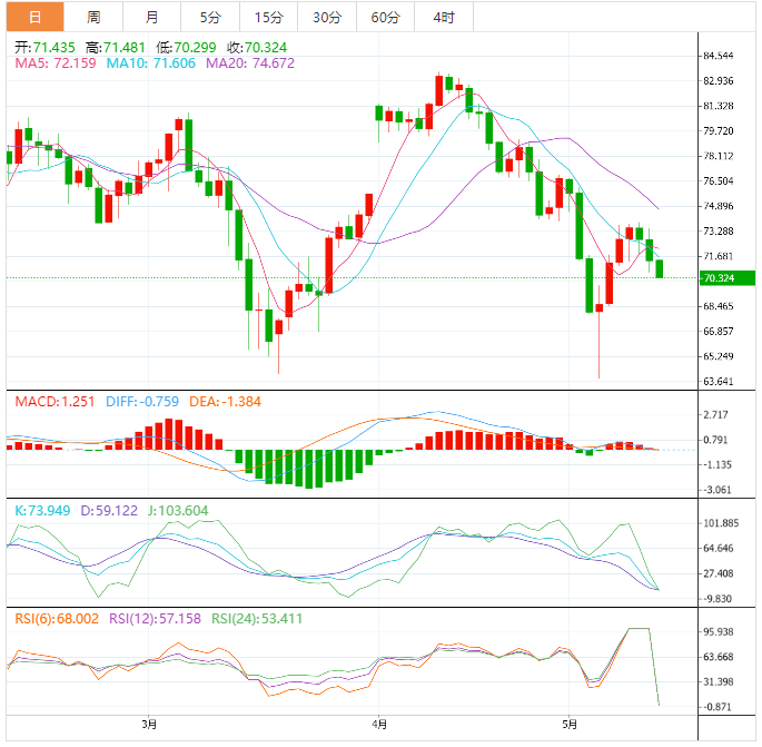 美原油:截止发稿,美原油小幅下跌,现报70.32,跌幅1.56%。欧市盘前,原油自一周高位回落后,连续第三天承压,上周五早间在71.10美元附近刷新盘中底部。能源基准就证明了前一天跌破100和200小时移动平均线(hma)是合理的。MACD和RSI指标(也被称为振荡指标)的疲软状况,增加了对黑金的看跌偏见。