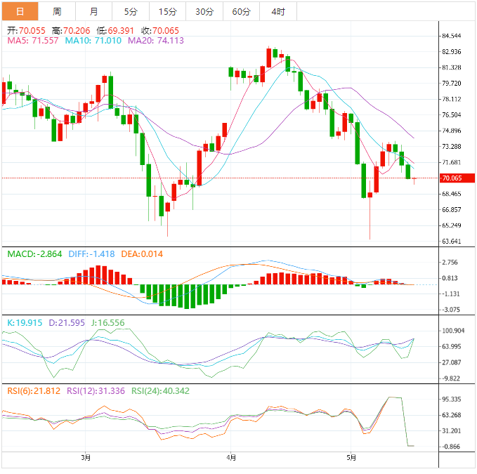 美原油:截止发稿,美原油小幅上涨,现报70.09,涨幅0.06%。欧市盘中,原油在70.00美元附近出现了相当大的横盘走势。随着美国债务上限谈判的推迟加深了人们对经济衰退的担忧,油价持续面临抛售压力。