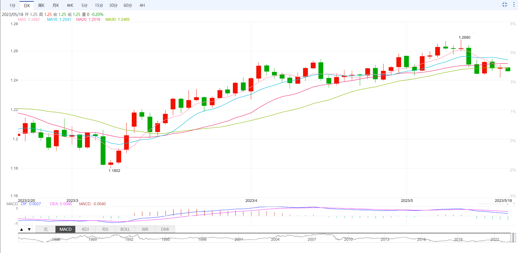 英镑/美元:截止发稿,英镑/美元走低,现报1.2470,跌幅0.26%。欧市盘前,英镑/美元震荡于1.2500心理阻力位下方。在缺乏关键催化剂的情况下,英镑/美元方向不明。美元指数正试图止跌,处在1.2480附近,然而,由于白宫已同意放弃总统开支主动权,换取上调债务上限,美元指数似乎倾向于下跌。
