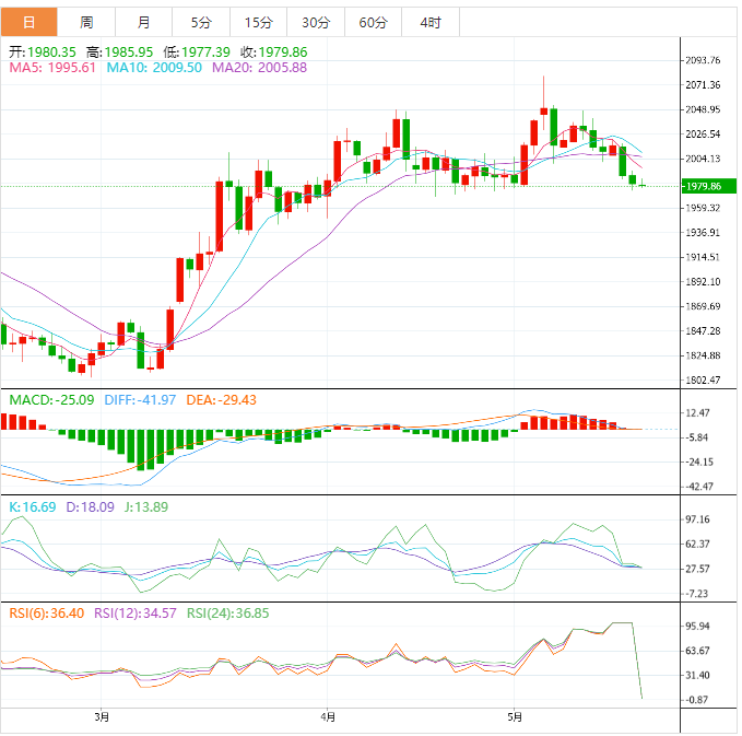 现货黄金:截止发稿,现货黄金小幅看跌,现报1977.89,跌幅0.08%。欧市盘中,金价小幅上涨至1985美元附近,接近三週最低水平,结束两日下跌。美元在数日顶部难以延续最新涨势,同时围绕美国违约状况的人气不一以及美国零售销售下降也提振该贵金属。展望未来,缺乏重大数据/事件可能会让金价回补,但风险催化因素是观察明确方向的关键。