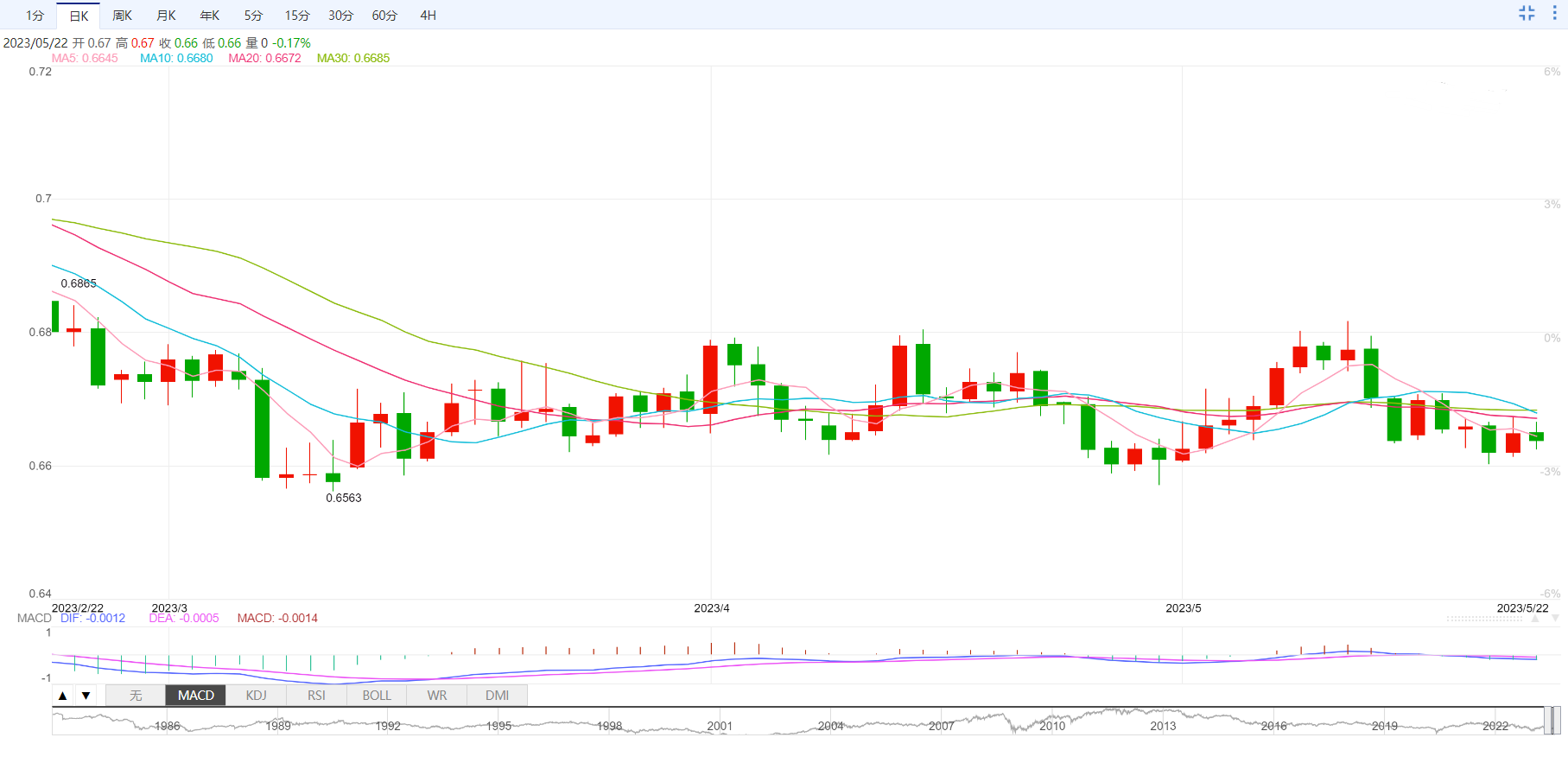 周一盘中,美元指数下跌至103.11,跌幅0.08%;欧元兑美元上涨至1.0818,涨幅0.15%;英镑兑美元上涨至1.2447,涨幅0.02%;美元兑日元下跌至137.86,跌幅0.01%;澳元兑美元下跌至0.6639,跌幅0.16%。