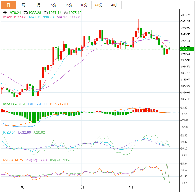 技术面:金价已回升至潜在阻力位上方,该阻力位已从4月19日低点1,969.26美元转为支撑位。在反应迅速的买家出现之际,金价从1950.00美元左右出现v型反弹。