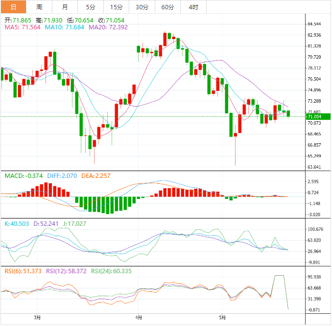 美原油:截止发稿,美原油小幅下跌,现报71.05,跌幅0.88%。欧市盘中,WTI原油期货在72.00美元以下来回波动。由于投资者正在等待美国债务上限谈判的结果,预计油价将继续盘整。