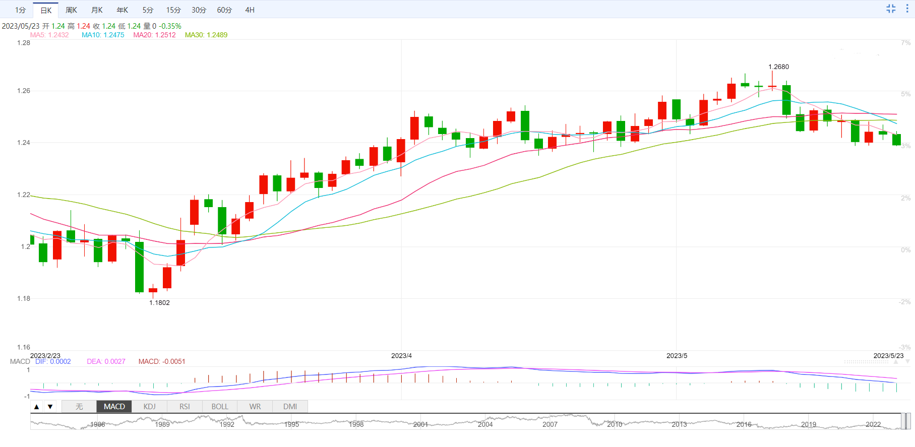 技术面:美元指数上涨0.10%报103.33,若升破103.62(5月18日高点)可能将打开升向105.74(200日SMA)和105.88(2023年3月8日高点)的大门。另一方面,下一个支撑位于55日SMA均线102.49,其次为101.01(4月26日低点)和100.78(2023年4月14日低点)。
