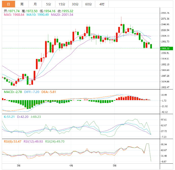 现货黄金:截止发稿,现货黄金小幅看跌,现报1955.60,跌幅0.82%。欧市盘中,黄金价格在接近1961美元的盘中低点附近仍处于守势,连续第二天下跌,扭转了周二欧洲市场早些时候周五的修正反弹。因此,在包括美国在内的主要经济体5月份采购经理人指数(PMI)初值公布之前,贵金属承受了美元走强的压力。