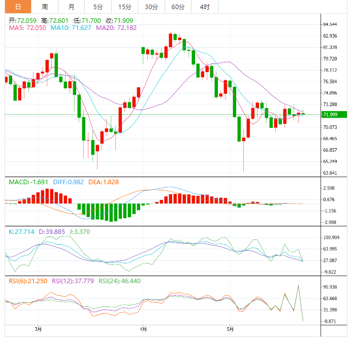 技术面:未能突破21日移动均线,加入了跌破两周以来上行支撑线(最晚接近72.55美元)的下行通道,这让西德克萨斯中质原油空头充满希望。