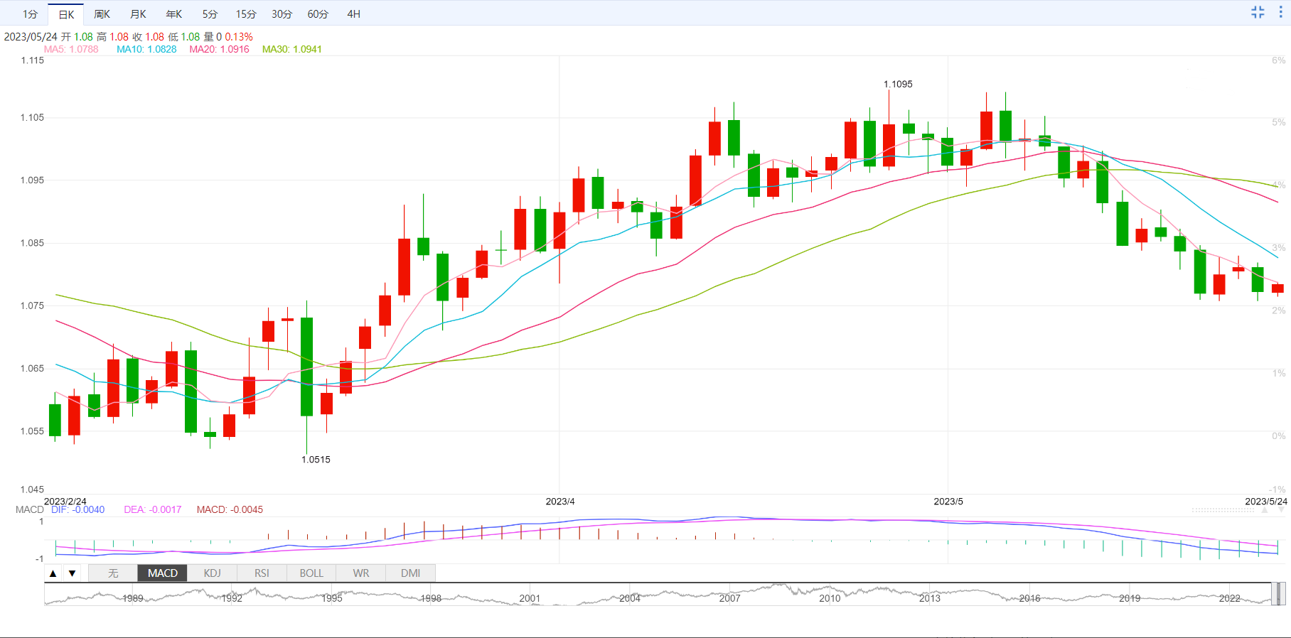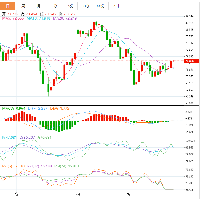 美原油:截止发稿,美原油小幅上涨,现报73.82,涨幅0.12%。欧市盘前,汽油市场供应将收紧,叠加OPEC+或将进一步减产,诸多利多或盖过美债务上限谈判进展甚微的影响,若晚间EIA数据进一步显示库存下降,油价有望剑指75美元/桶关口。