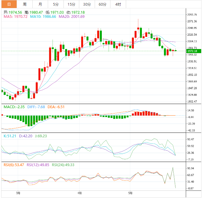 现货黄金:截止发稿,现货黄金小幅看跌,现报1972.54,跌幅0.13%。欧市盘前,黄金价格轻松突破关键阻力位1,970.00美元。在周三美国联邦公开市场委员会(FOMC)公布5月份货币政策会议纪要之前,金价预计将进一步延续涨势。