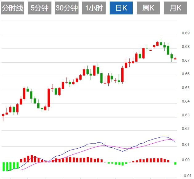 日线图上,澳元/美元跌破21日均线(今天在0.6730),各项技术指标转向下行,似乎确认上涨趋势结束。下一支撑位在10月至12月升势的38.2%回档位0.6641。