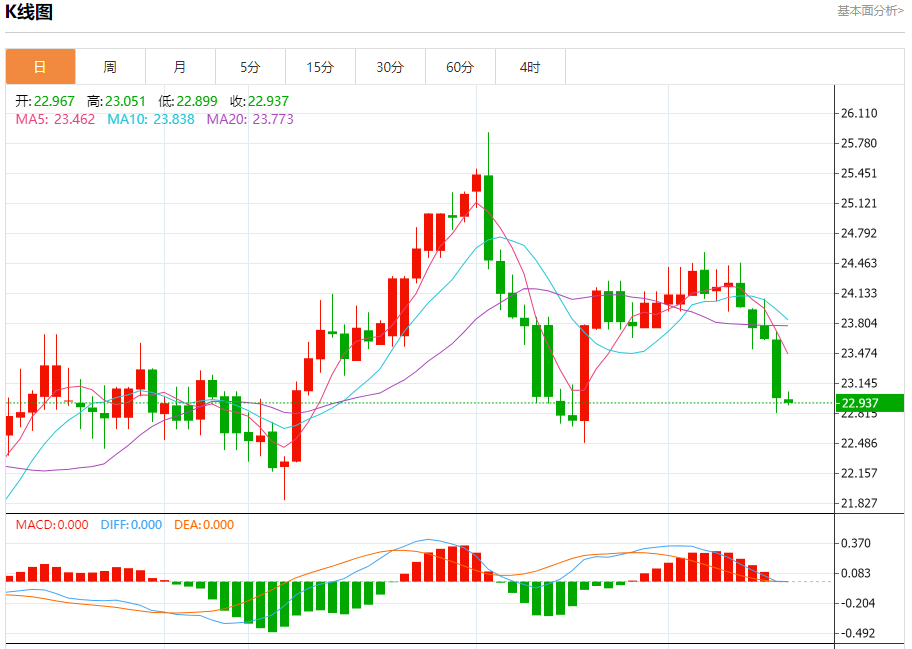 现货白银:截止北京时间21:20,现货白银下跌,现报22.941,跌幅0.04%。纽市盘前,白银价格徘徊在23.00水平附近,并显示出一些轻微的积极尝试,只要价格低于这一水平,我们的熊市概览今天将仍然有效,因为突破它代表着开始牛市的关键,可能会达到23.70,然后再次转向下跌,而今天预期熊市的下一个目标位于22.25。