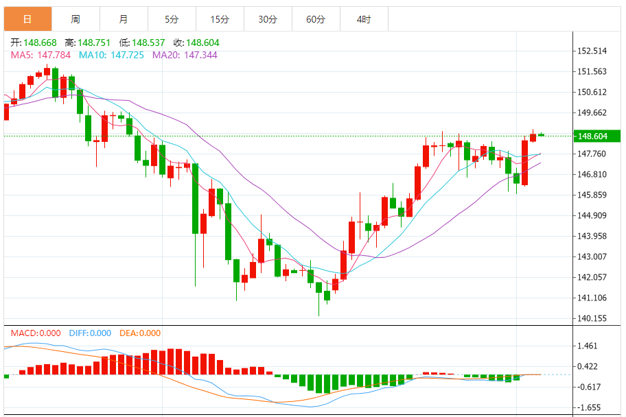 日元:美元/日元上涨,收报148.671,涨幅0.24%。技术面上,汇价上行的初步阻力位于148.958,进一步阻力位149.24,关键阻力位于149.589;汇价下行的初步支撑位于148.327,进一步支撑位于147.978,更关键支撑位于147.696。
