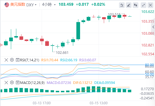 上周五,因美国2月PPI数据超预期,美元指数震荡上涨,最终收涨0.071%,报103.44。截至目前,美元报价103。45。