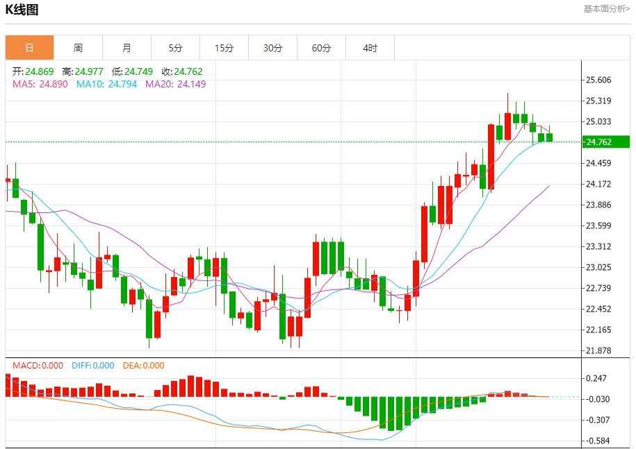 现货白银:截止北京时间21:26,现货白银下跌,现报24.771,跌幅0.49%。纽市盘前,白银价格现在显示出轻微的看跌倾向,通过深入查看图表,我们发现价格正在形成潜在的头肩顶模式,其迹象出现在图像上,这促使人们对即将到来的交易保持谨慎,因为突破24.60将激活该模式的负面影响,并推动价格在盘中转为下跌。