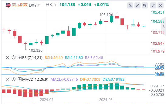 周—,美元指数震荡走低,最终收跌0.146%,报104.14美债收益率延续涨势。截至目前,美元报价104.153。