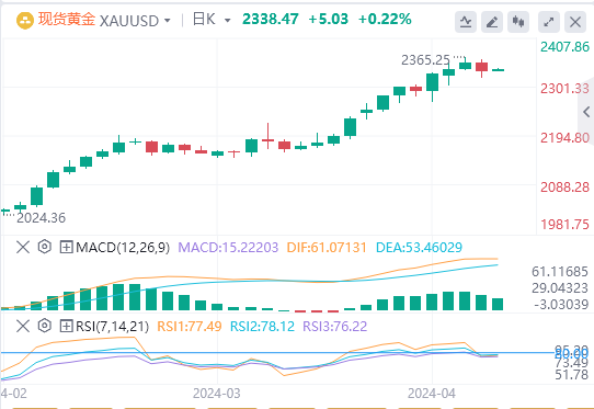 周四亚盘,黄金交投于2338.47附近。黄金在美国消费者价格指数(CPI)发布后下跌0.66%后收于2,336美元。美国劳工统计局(BLS)宣布,3月份的CPI高于预期,尽管与2月份的数据相比,四项通胀数据中有三项没有变化。与此同时,整体通胀率跃升至年度预测和上个月的读数之上。