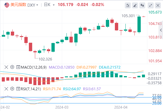 105.179附近。周三,由于连月超预期的CPI数据击溃了市场对美联储的降息预期,美元指数冲高至105关口上方,最终收涨1.043%,报105.2,创去年11月以来最高水平。美债收益率集体狂飙。10年期美债收益率上破4.5%的关键门槛,收报4.514%。对美联储政策利率最敏感的2年期美债收益率大涨近20个基点,收报4.941%。5/30年期美债收益率自9月份以来首次倒挂。非美货币纷纷承压,美元兑日元向上触及153关口,续创1990年6月以来新高。部分机构将153关口作为日本当局出手干预的主要节点。欧元兑美元跌1%,为去年7月最大日内跌幅。美元兑加元一度突破1.37,为去年11月以来首次。现货黄金从历史高位回落,盘中一度较日高跌约40美元,最终收跌0.79%,报2333.73美元/盎司;现货白银失守28关口,最终收跌0.9%,报27.9美元/盎司。随着美国准备应对伊朗或其代理人对以色列的“迫在眉睫”的报复,国际原油反弹。WTI原油美盘刷新日低后迅速拉升,最终收涨1.08%,报86.2美元/桶;布伦特原油收复90关口,收涨1.21%,报90.6美元/桶。