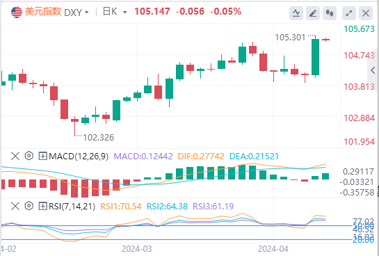 美元指数昨日飙升约1%,其中70%的涨势是在美国通胀报告发布后的第一个小时内走出的。美元的涨势源于强劲的成交量,这可能是空头回补和新的多头交易共同作用的结果,美元指数自去年11月以来首次小幅收高于105。美元指数可能会在今天继续上涨,但在强势突破之后继续维持较强的看涨势头是比较少见的,因此多头可能会参考更小的时间框架来交易,或者等待日线图行情的回调,并在行情低点找入场机会。而由于美联储很有可能只降息一次,或者根本不降息,美元指数的下一个多头目标似乎将是106。