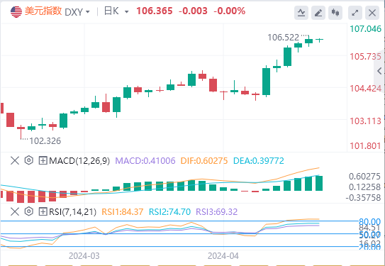鲍威尔暗示美联储短期内没有降息计划,美元指数继续走强,最终收涨0.152%,报106.37,收获日线五连阳。美债收益率延续涨势。10年期美债收益率一度逼近4.7%关口,再创五个月新高,最终收报4.661%。美截至目前,美元报价106.365。