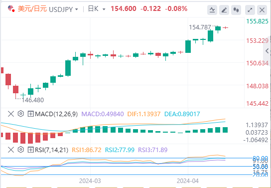 美元/日元周二触及154.80附近的又一个数十年高点。该货币对在亚洲时段小幅回落,似乎在154.50附近企稳。