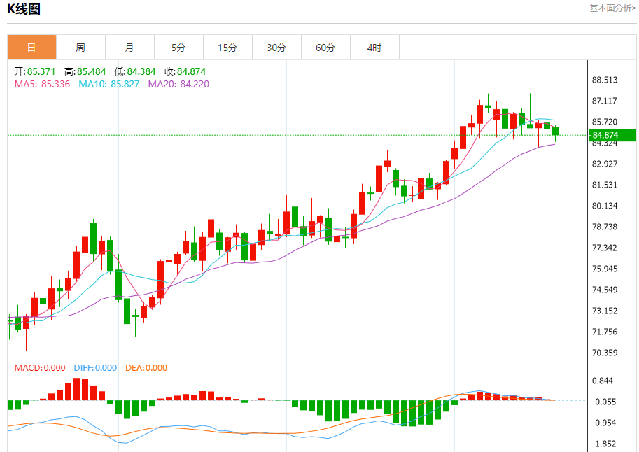 原油市场:截止北京时间20:18,美油下跌,现报84.881,跌幅0.45%。纽市盘前,原油价格自上午以来交易疲软,停留在85.00美元关口附近。等待突破85.40美元,以加强对未来几个交易日继续看涨趋势的预期。