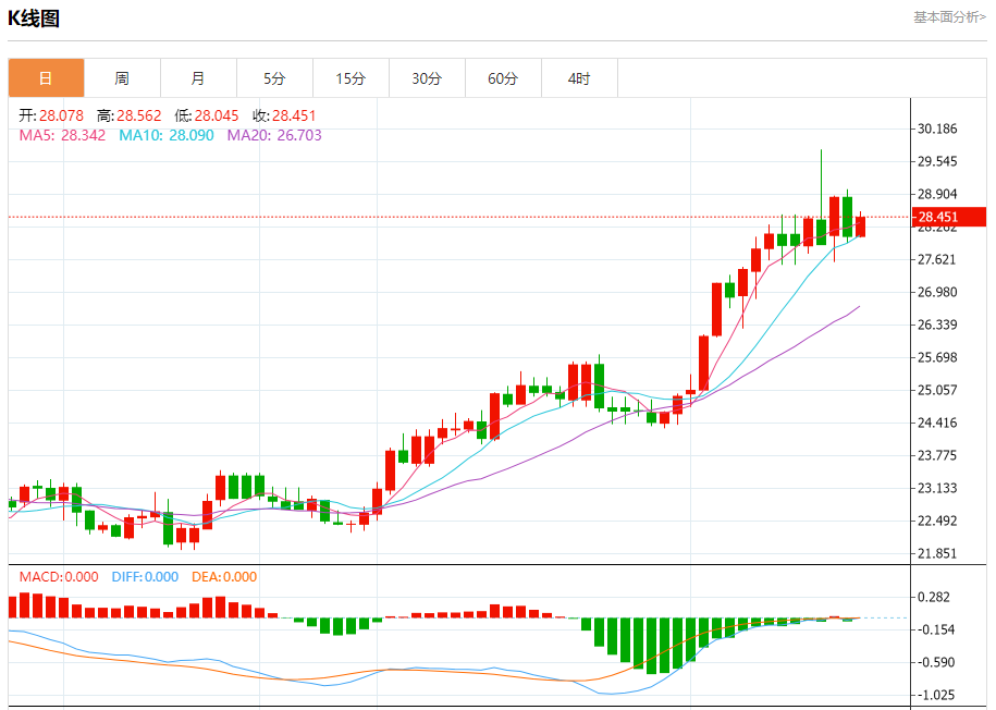 现货白银:截止北京时间20:18,现货白银上涨,现报28.451,涨幅1.32%。纽市盘前,白银价格恢复积极交易,脱离28.00美元水平。对今天剩余时间继续看涨趋势的预期得到加强。