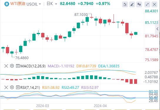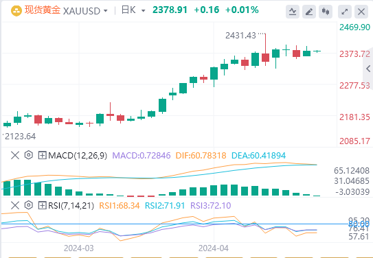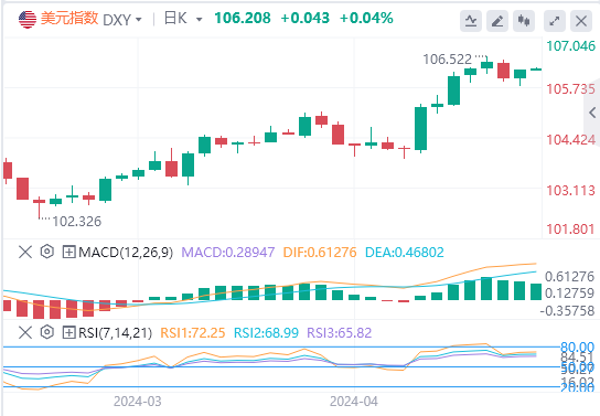 106.208附近。周四,随着美联储官员继续打压市场的降息预期,美元指数盘中转涨,收复106关口,最终收涨0.211%,报106.17。美债收益率回升。在“美联储三把手”提及加息可能性后,10年期美债收益率冲高,最终收报4.643%。对美联储政策利率最敏感的2年期美债收益率再次上探5%,最终收报4.99%。由于中东持续的紧张局势增加了黄金的避险吸引力,现货黄金重启涨势,盘中最高触及2392.67,最终收涨0.75%,报2378.97美元/盎司;现货白银整体上先涨后跌 ,最终收涨0.05%,报28.24美元/盎司。国际油价连续第四个交易日走低,再创近三周新低,但跌势较前一日有所放缓。WTI原油一度跌破82关口,最终收跌0.5%,报82.85美元/桶;布伦特原油收跌0.6%,报86.86美元/桶。其他大宗商品方面,2024年最猛品种依旧表现强劲,可可期货飙升逾10%,突破1.1万美元/吨。