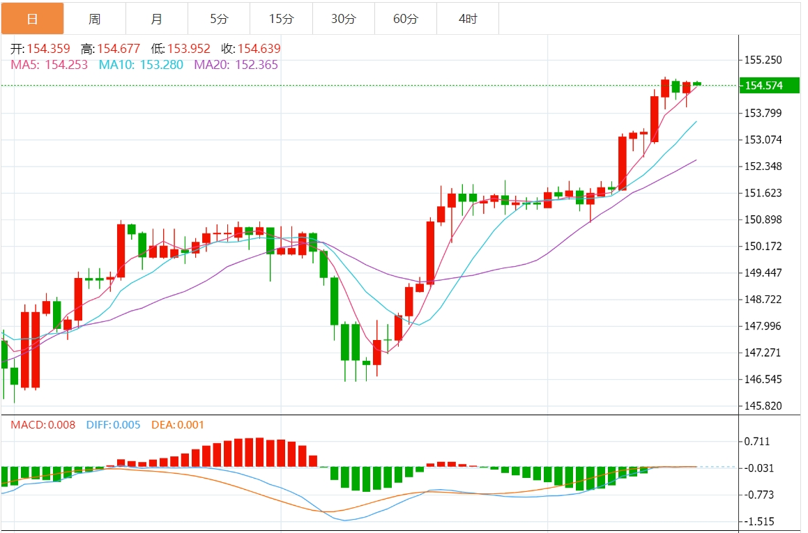 日线图上看,美元/日元突破4月16日高点154.787将支撑其升至155关口。相反,美元/日元跌破153.5关口,可能会让空头挑战151.685支撑位。