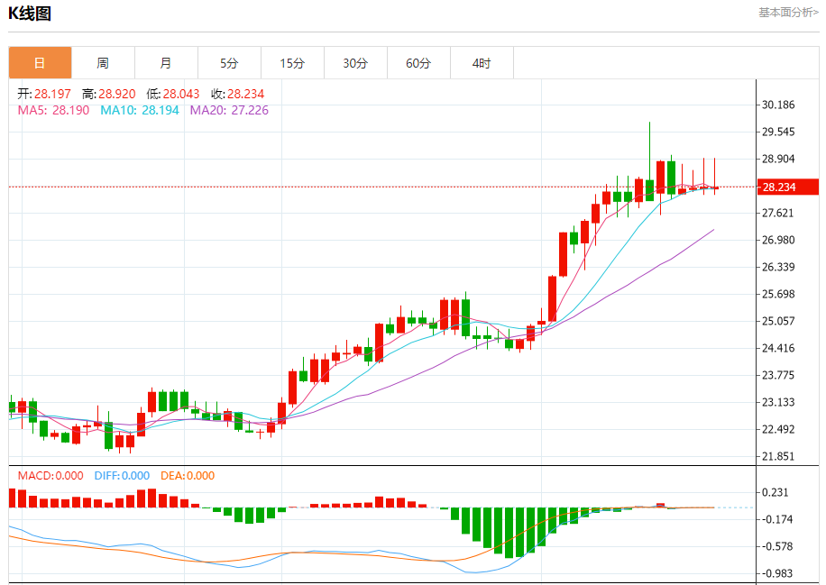 现货白银:截止北京时间20:22,现货白银上涨,现报28.229,涨幅0.06%。纽市盘前,银价返回测试28.00美元的关键支撑。EMA50试图保护今天预期的积极情景。