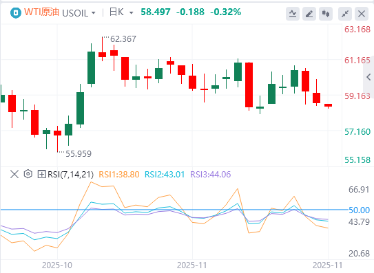 周五亚盘,原油交投58.49附近。油价周四震荡收跌,尽管美国原油库存降幅超预期带来支撑,但美国推动俄乌和谈的消息引发供应过剩担忧,最终压制了市场情绪。市场正密切关注周五美国对俄罗斯石油公司和卢克石油制裁的生效情况,以及乌克兰对最新和平提议的正式回应,这些因素将决定短期油价走向。