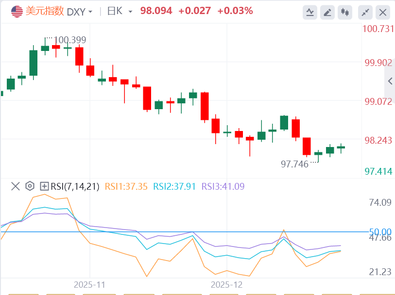 上周五,美元指数在98关口附近震荡,最终收涨0.113%,截至目前,美元指数报价98.09。