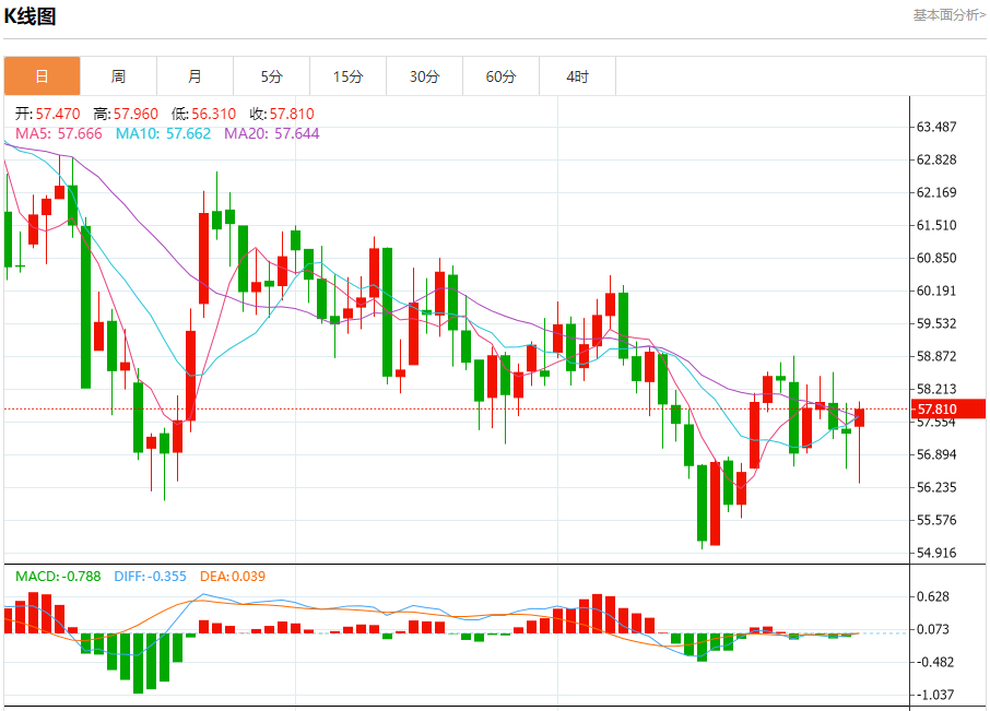 原油市场:截止北京时间21:20,美油上涨,现报57.790,涨幅0.82%。纽市盘前,(原油)价格在最后的盘中交易中呈现波动走势,在达到超卖水平后,相对强弱指标出现积极信号,使价格触及EMA50阻力位,这可能会在短期内减缓上涨速度,尤其是在其短期交易中伴随小幅看跌趋势线的情况下,这降低了短期内可持续反弹的可能性。