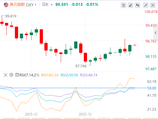美元:截止发稿,美元指数徘徊于98.41附近,美元兑主要货币在12月下跌,但在圣诞节前后真正触底,在周五就业数据公布之前,美元将出现上行修正,本周及下周的通胀、工业生产和零售销售等数据,或将强化美国经济未进一步恶化、美联储在第一季度将按兵不动的观点。目前价格已收复98.24的50%斐波那契回撤位,眼下正测试98.74一线阻力——该位置同时也是前期的关键支撑位。上方来看,99.00关口的200期指数平均线(200-SMA)是重要阻力位;下方支撑则位于98.12和97.90。当前相对强弱指标(RSI)读数为69,释放出积极的动能信号。