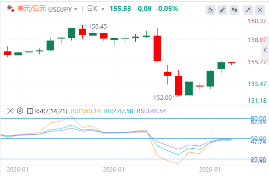美元兑日元周一上涨超过0.5%,但在测试156.00前遇到阻力。周二欧洲早晨,货币对相对平稳,波动约在155.50左右。