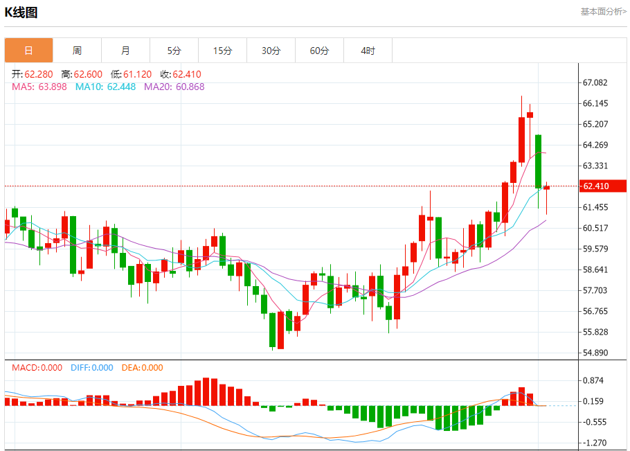 原油市场:截止北京时间21:20,美油上涨,现报62.410,涨幅0.43%。纽市盘前,(原油)价格在最后一个交易日继续波动交易,受其在短期基础上依赖于次要趋势线支撑的影响,受相对强度指标出现积极信号的支持,这有助于价格在短期基础上的大幅熊市后稳定下来,此外,由于其交易低于EMA50,阻止了价格回升的负面压力。