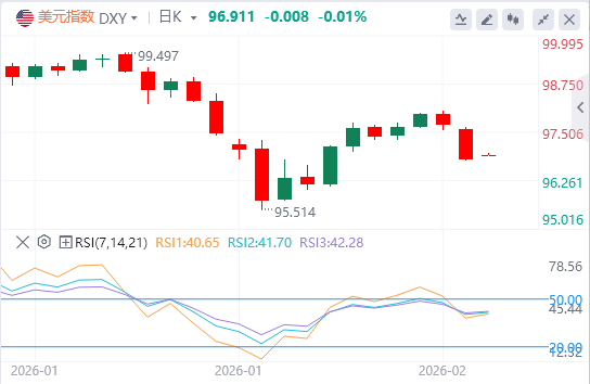 2月10日,北京时间周二亚市早盘,美元指数徘徊在96.9154附近。周一,美元指数走势低迷,跌至一周低点,最终收跌0.91%,报96.79;美债收益率普跌,基准的10年期美债收益率收报4.204%,对美联储政策利率敏感的2年期美债收益率收报3.487%。在市场等待一系列美国经济数据之际,美元走弱使得以美元计价的大宗商品对海外买家更具吸引力。现货黄金延续涨势,最高触及5086.42美元/盎司,最终收涨1.93%,报5060.53美元/盎司;现货白银一度触及84美元关口,最终收涨7.17%,报83.37美元/盎司。国际原油低开高走,因美国警告悬挂美国国旗的船只在霍尔木兹海峡航行时应尽可能远离伊朗水域。WTI原油美盘加速上涨,最终收涨1.45%,报64.45美元/桶;布伦特原油收涨1.71%,报68.70美元/桶。