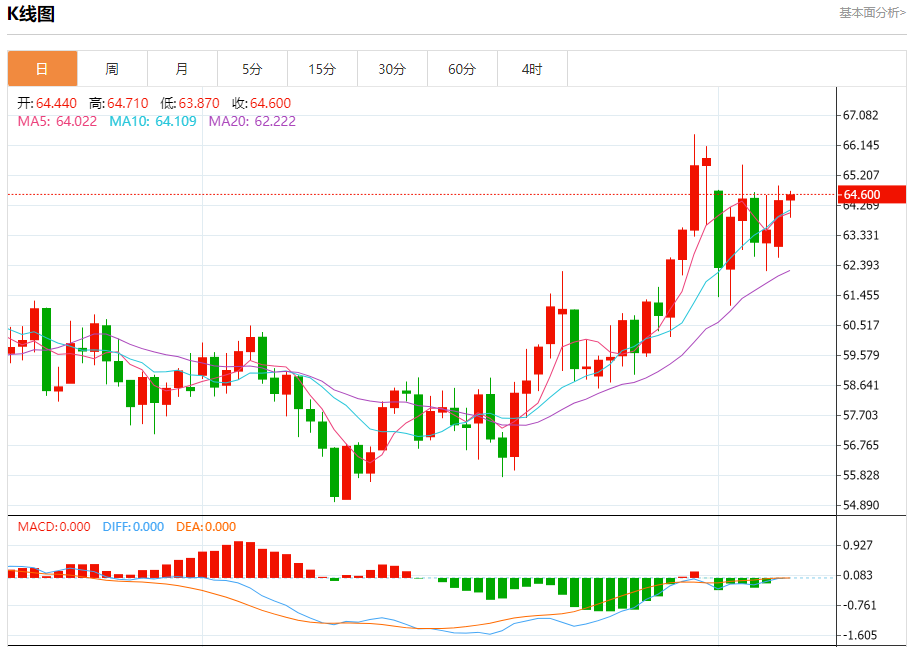 原油市场:截止北京时间21:20,美油上涨,现报64.590,涨幅0.37%。纽市盘前,(原油)价格在其最后一个交易日的水平上波动交易,试图获得可能有助于其恢复和再次上涨的看涨势头,试图在主要看涨趋势占主导地位的情况下,在相对强势指标上卸载其超买条件,其交易沿着这条路径的支撑趋势线进行,除了其在EMA50上方的交易所代表的动态支持之外,加强了未来一段时间价格恢复的机会。