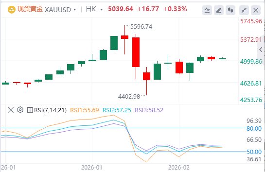技术面:黄金价格继续在5000美元/盎司至5100美元/盎司区间波动,交易员始终未能攻克该区间的顶部/底部,正等待新的催化剂。相对强弱指数(RSI)虽然显示看涨,但正朝着中性水平靠拢。这表明卖方正在限制金价的上涨。如果金价突破5100美元/盎司,则有望进一步上涨至5200美元/盎司,随后可能冲击1月30日的高点5451美元/盎司,以及接近5600美元/盎司的历史高点。反之,如果金价跌破5000美元/盎司,则可能测试探20日简单移动平均线(SMA)4910美元/盎司,随后可能下探4800美元/盎司,最终瞄准2月2日的低点4402美元/盎司。