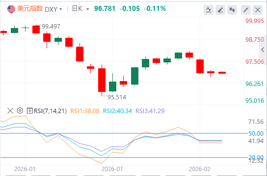 2月11日,北京时间周三亚市早盘,美元指数徘徊在96.78附近。周二,美元指数维持在一周低点附近横盘震荡,日内基本持平,收报96.8;美债收益率全线走低,基准的10年期美债收益率收报4.143%,对美联储政策利率敏感的2年期美债收益率收报3.452%。现货黄金止步两连涨,美国零售销售数据公布后一度短线拉升,但随后迅速回吐涨幅,最终收跌0.74%,报5022.87美元/盎司;现货白银盘中下破80美元关口,最终收跌3.19%,报80.72美元/盎司。随着市场等待美伊谈判、俄乌停战进展及美国经济与原油库存数据指引方向,国际原油区间震荡。WTI原油最低触及63.68美元/盎司,最终收跌0.4%,报64.19美元/桶;布伦特原油收跌0.27%,报68.53美元/桶。