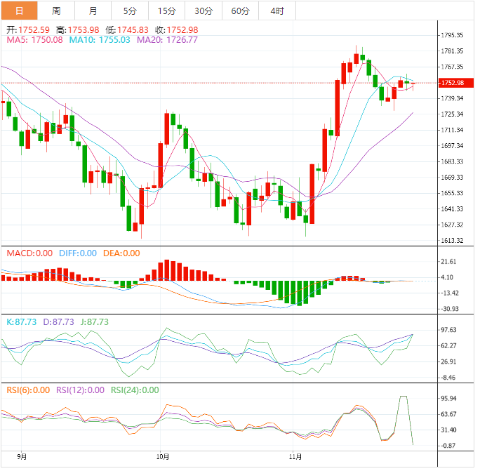 周一盘中,现货黄金震荡微跌,目前交投于1749.11美元/盎司,美元的反弹令金价承压,不过,疫情担忧情绪有所回升,亚洲股市普遍走弱,也给金价提供了一些避险支撑;此外,调查显示多数分析师和散户仍倾向于看涨黄金后市,失守1735前,金价偏向震荡上攻。本周经济数据和风险事件较多,美国感恩节假期刚刚结束,市场还存在一些观望情绪,整体交投还受到一定的限制。