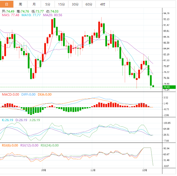 美原油在逾11个月低位徘徊,目前交投于74.32美元/桶附近,之前OPEC+决定不再进一步减产,欧盟俄罗斯石油价格上限和制裁形同虚设,美国股市持续下跌,再加上全球经济衰退担忧,市场对供给过剩的担忧在周二拖累油价跌至2021年12月28日以来新低,技术面看空信号也进一步加强,短线可能会进一步试探70整数关口附近支撑。