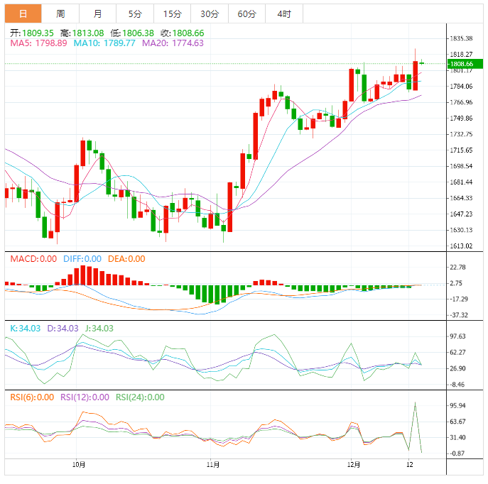 周三盘中,现货黄金窄幅震荡,目前交投于1810美元/盎司附近,在隔夜美国11月CPI数据弱于市场预期和前值后,市场普遍强化了对美联储放缓加息步伐的预期,金价大涨收复了200日均线和1800关口并顶破了8月份高点1807附近阻力,短线看涨信号有所增加。