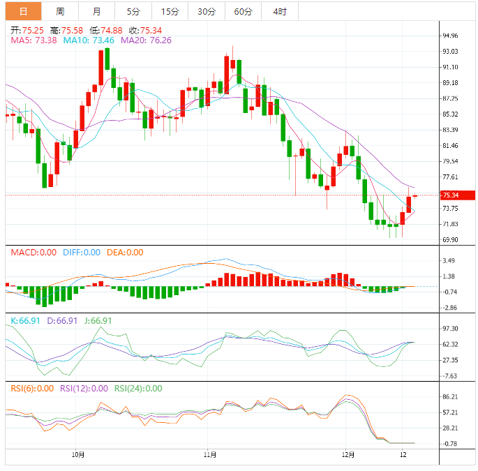 今天的预期交易区间在73.80支撑位和77.30阻力位之间。