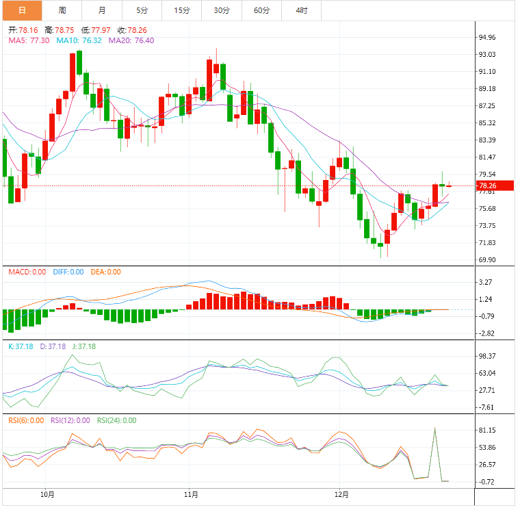 今天的预期交易区间在77.00支撑位和80.60阻力位之间。