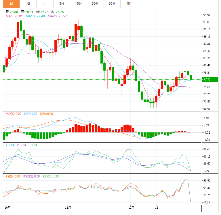 今天的预期交易区间在76.60支撑位和80.00阻力位之间。