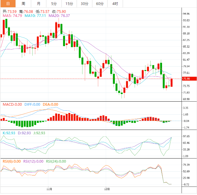 今天的预期交易区间在73.00支撑位和76.20阻力位之间。
