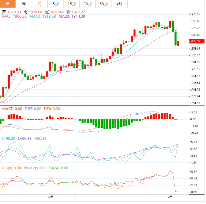 今天的预期交易区间位于1850.00支撑位和1890.00阻力位之间。